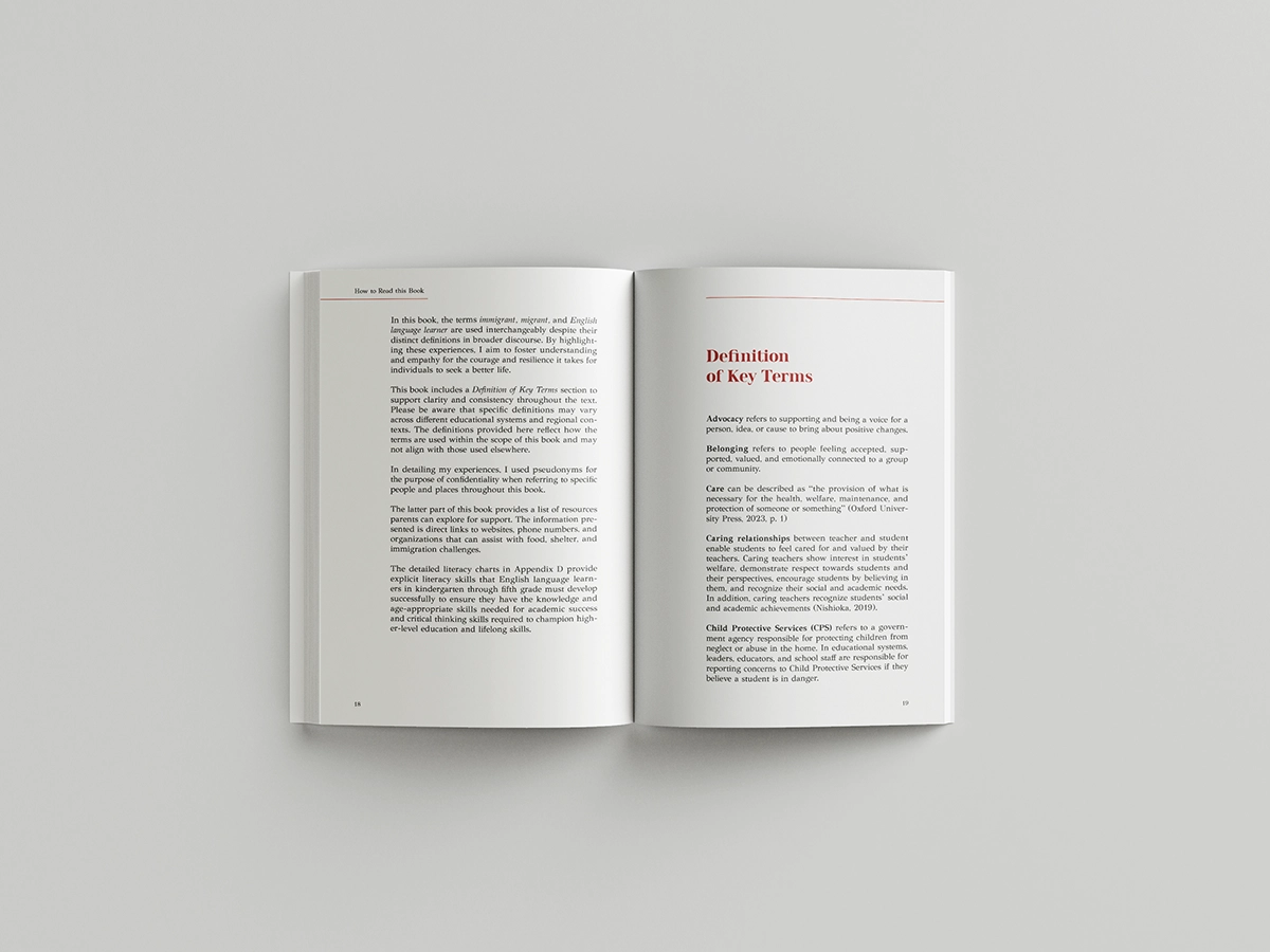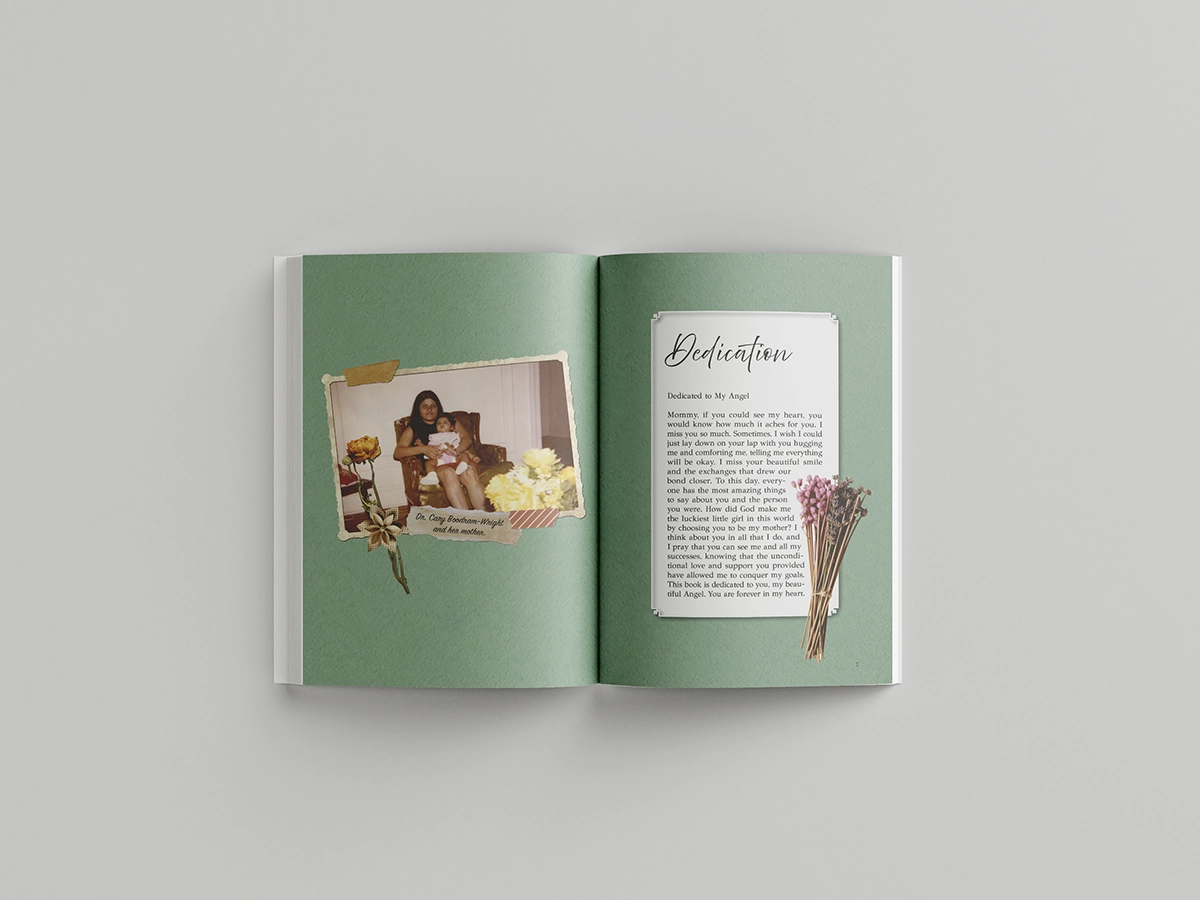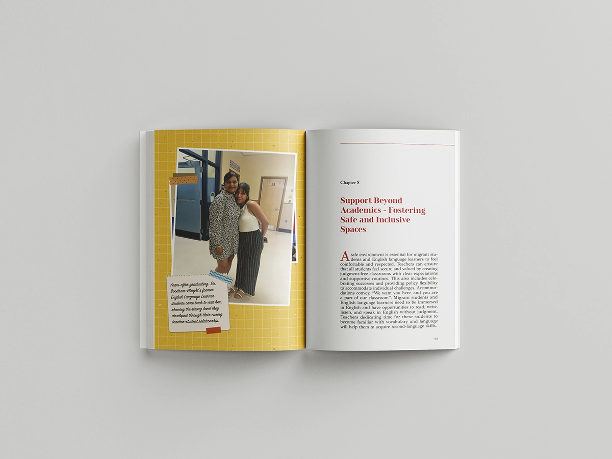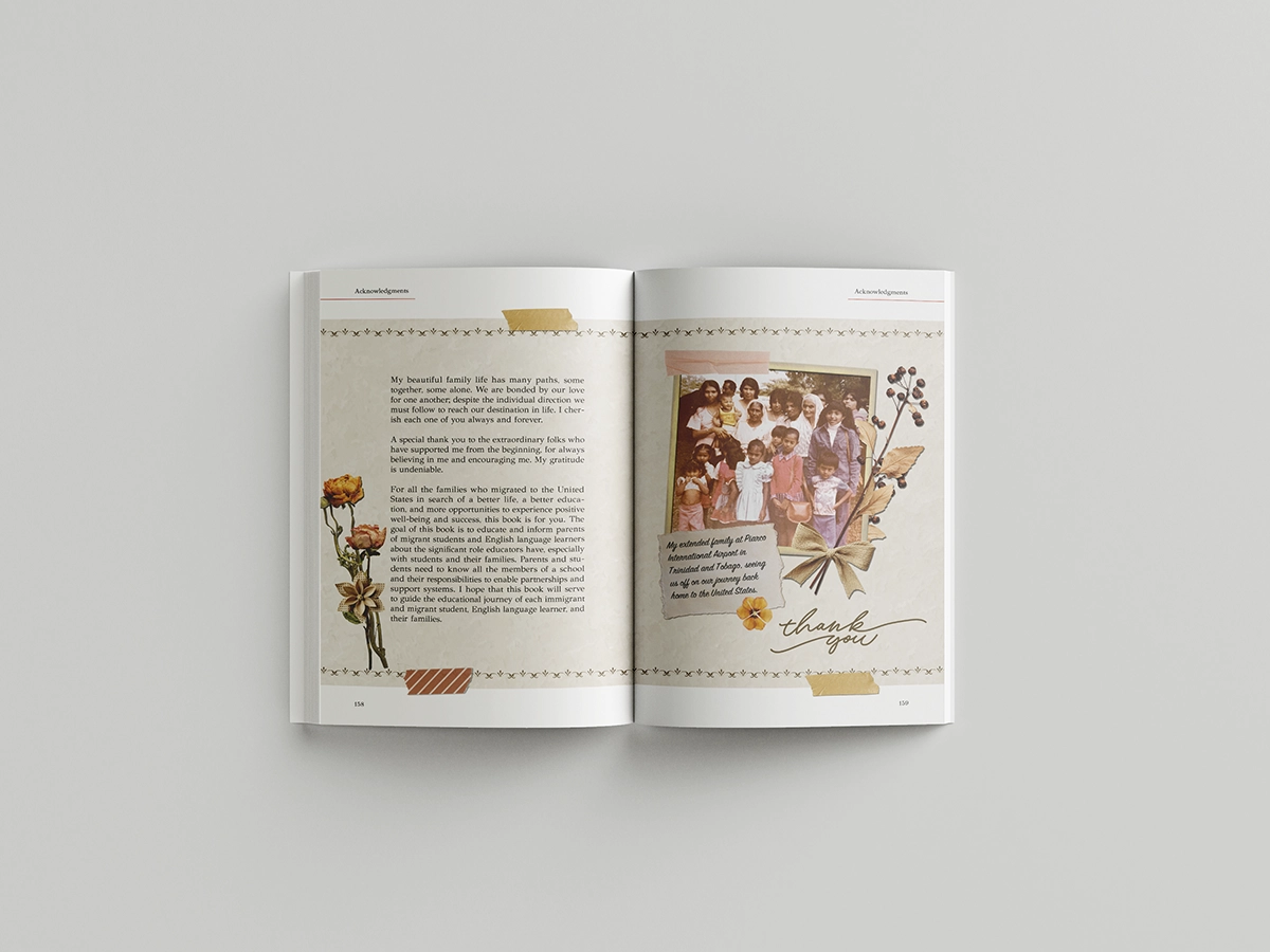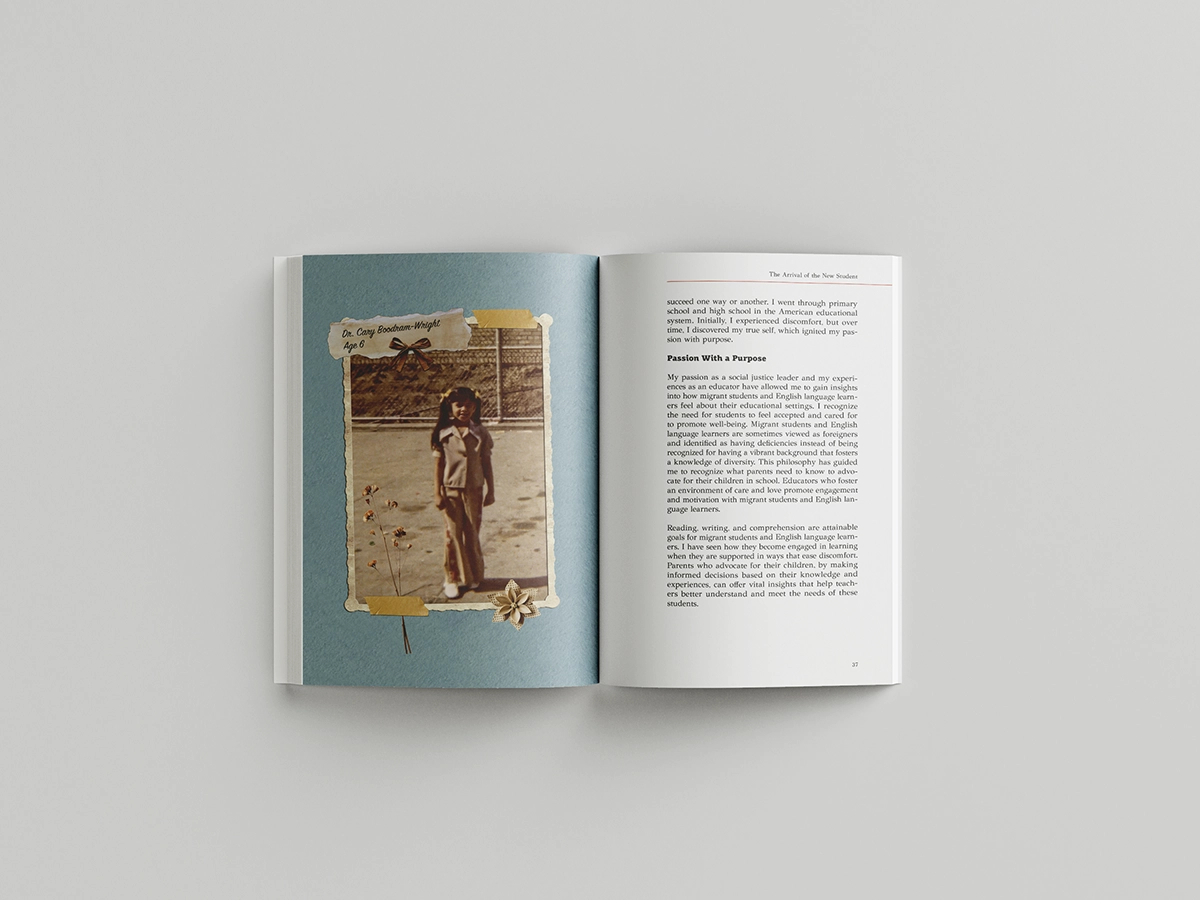 Inside the book, the layout follows a scrapbook-inspired aesthetic, using photographs, layered textures, and thoughtful composition to highlight key moments of the author’s journey. Each chapter balances visual storytelling with readability, enhancing the memoir’s reflective tone and its message about the transformative power of connection and care in educational spaces.